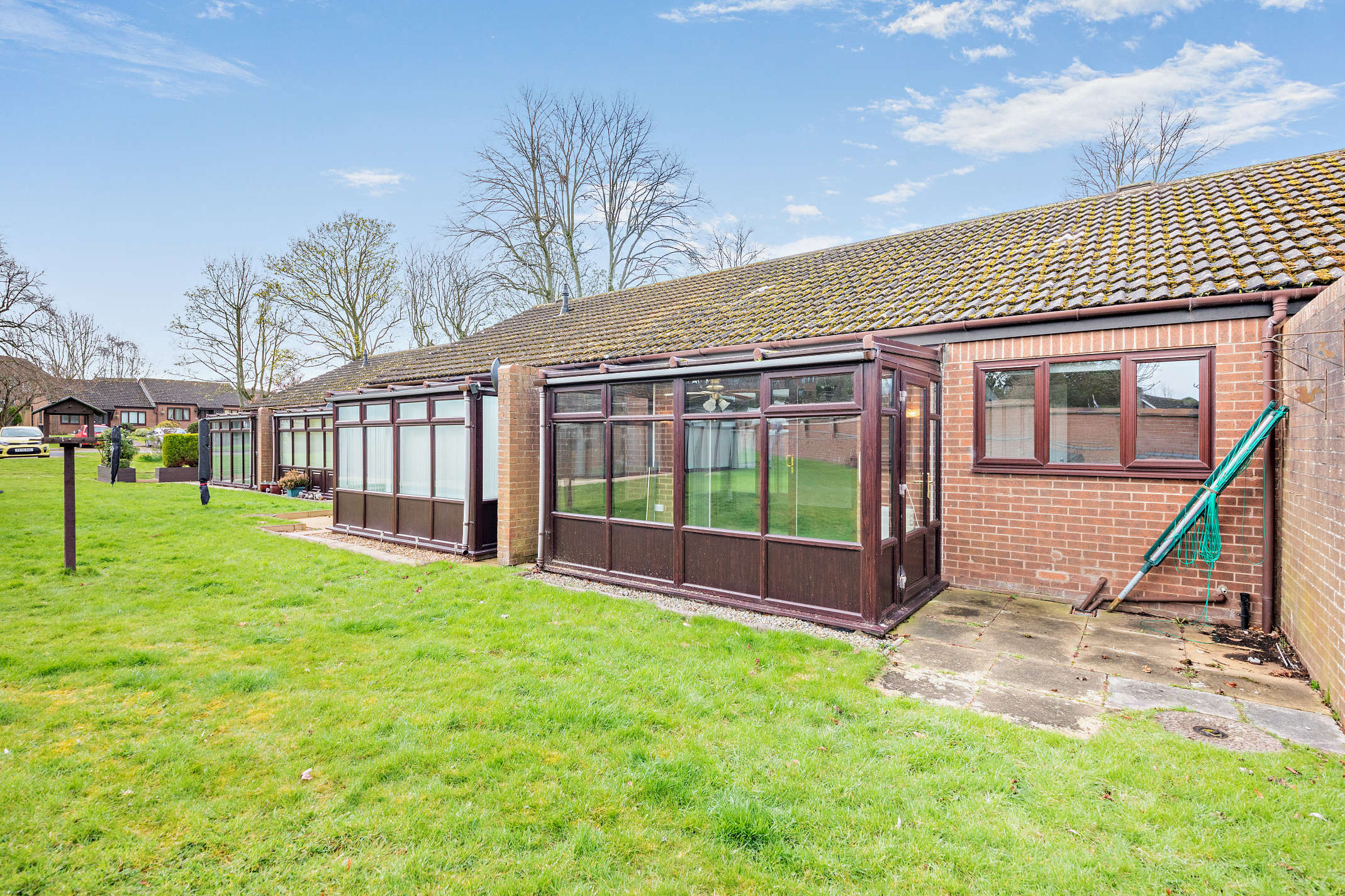 The property is approached over a communal front lawn with a path leading to the covered main entrance. To the side of the main entrance, there is a lockable store. The rear garden offers a private paved patio space bordered by communal lawn.