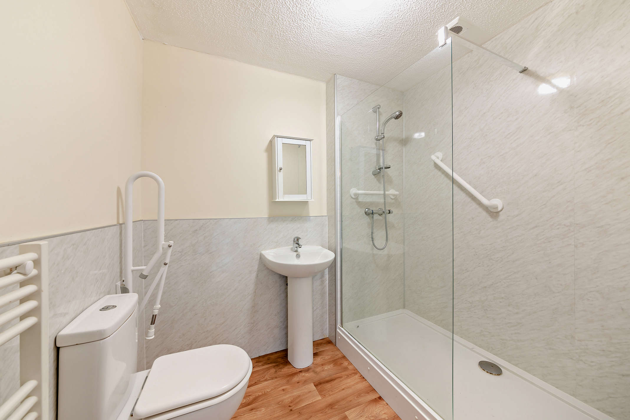 This room is a good size and comprises a large walk-in shower, white washbasin and WC.