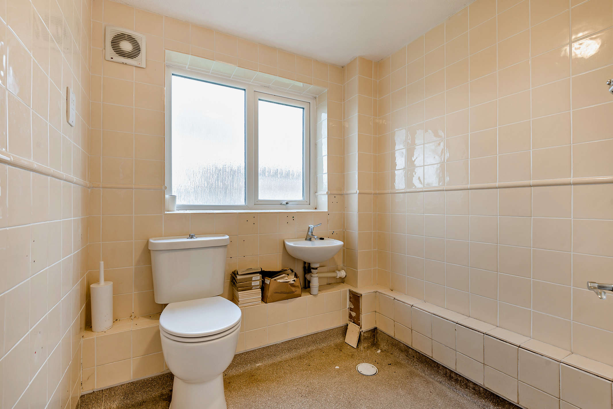 The accommodation includes two well-proportioned bedrooms, a wet room-style bathroom fitted with a toilet, sink, and overhead shower, and a kitchen/dining area requiring the installation of a new kitchen. The property also benefits from a spacious lounge, featuring patio doors opening onto the communal garden, allowing for plenty of natural light.