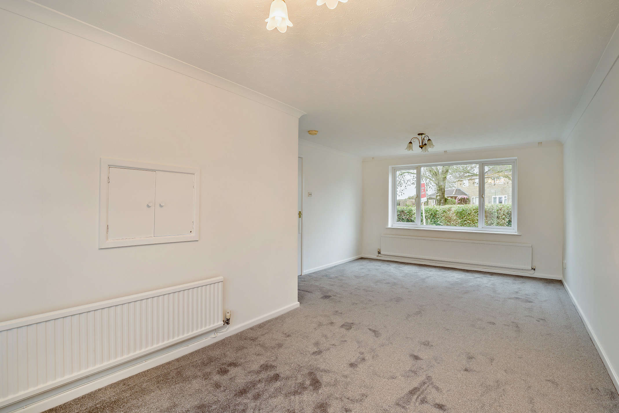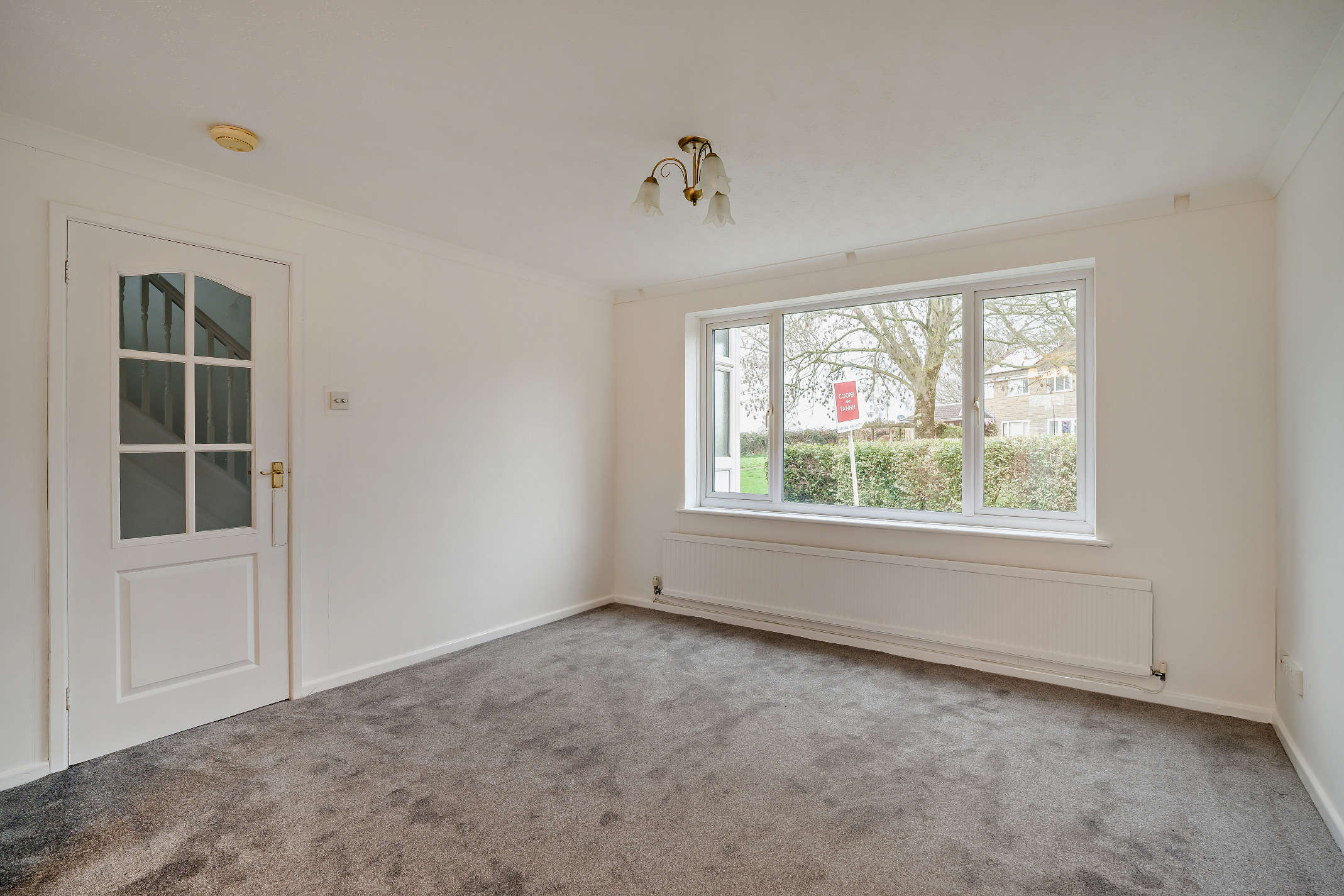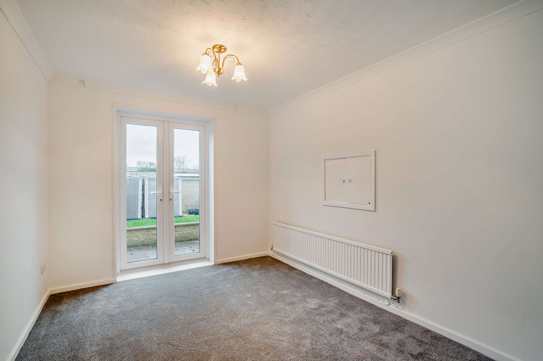 The spacious living room features a front aspect window and carpeted flooring. From here double French doors opens up to the rear garden.
