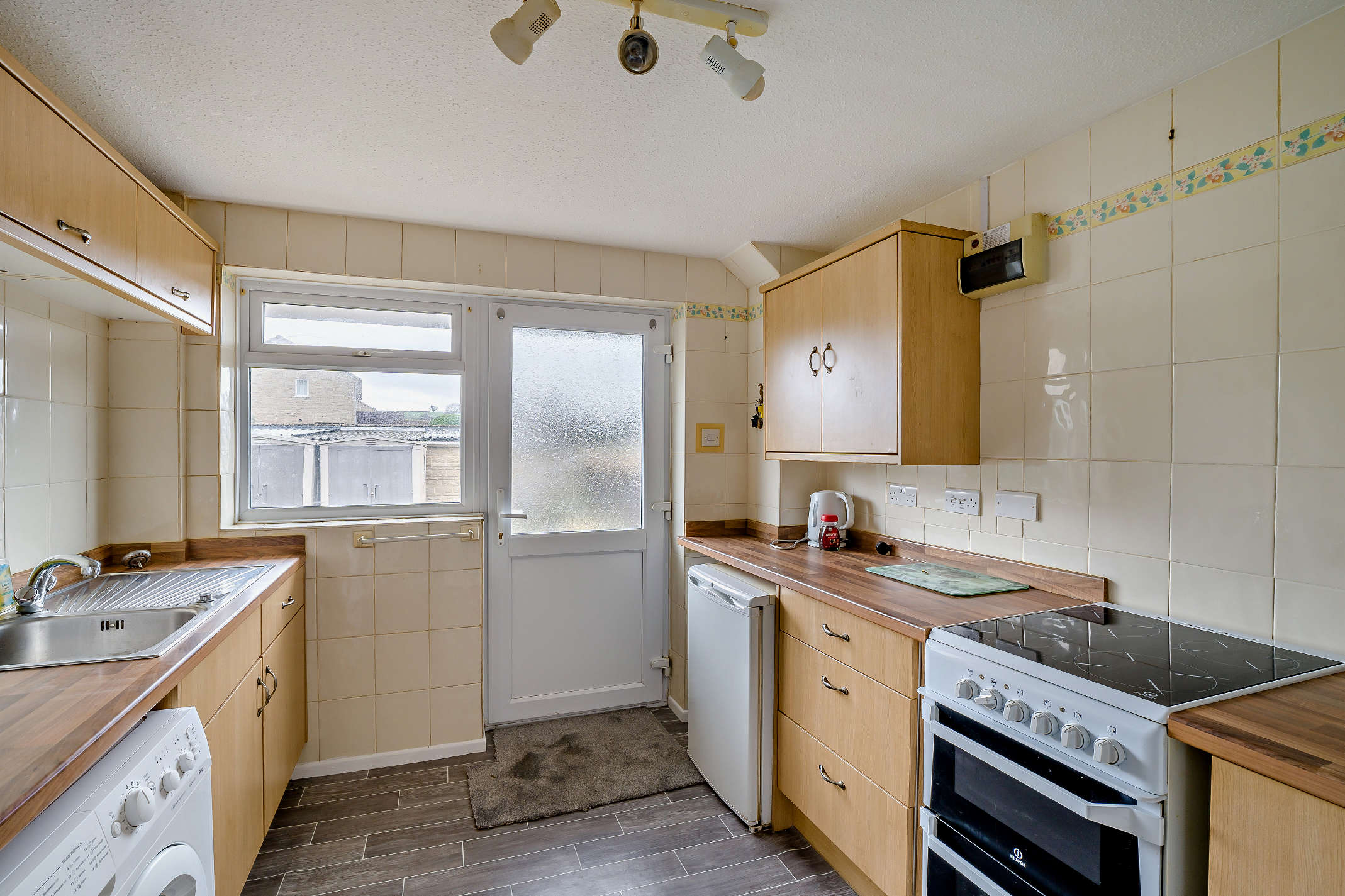 The kitchen is fitted with storage cupboards and built-in utilities, including an oven and hob.